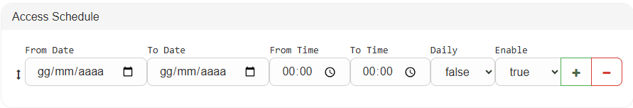 enable = trueanddaily = false: Absolute scheduling. Access is allowed only within a continuous interval between:fromDate + fromTimeandtoDate + toTime. Example:Parameter Value fromDate2025-10-01 fromTime08:00 toDate2025-10-05 toTime19:00 Access is valid only from 01/10 at 08:00 to 05/10 at 19:00.